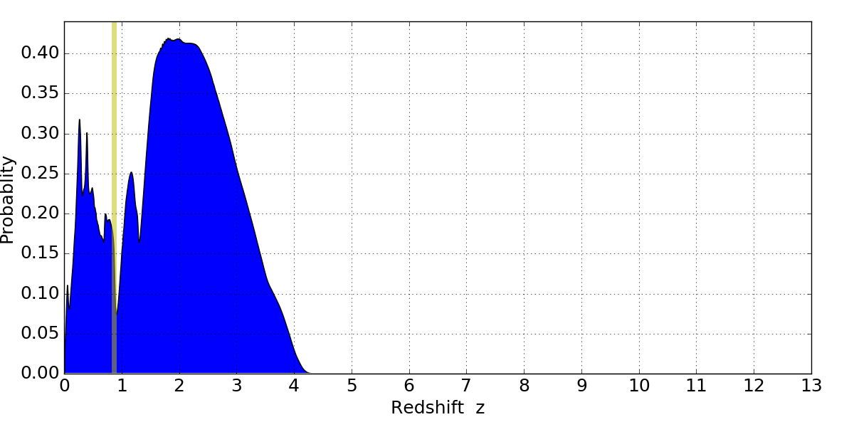 In P(z) plots: Yellow lines mark the cluster redshift z = 0.870,
