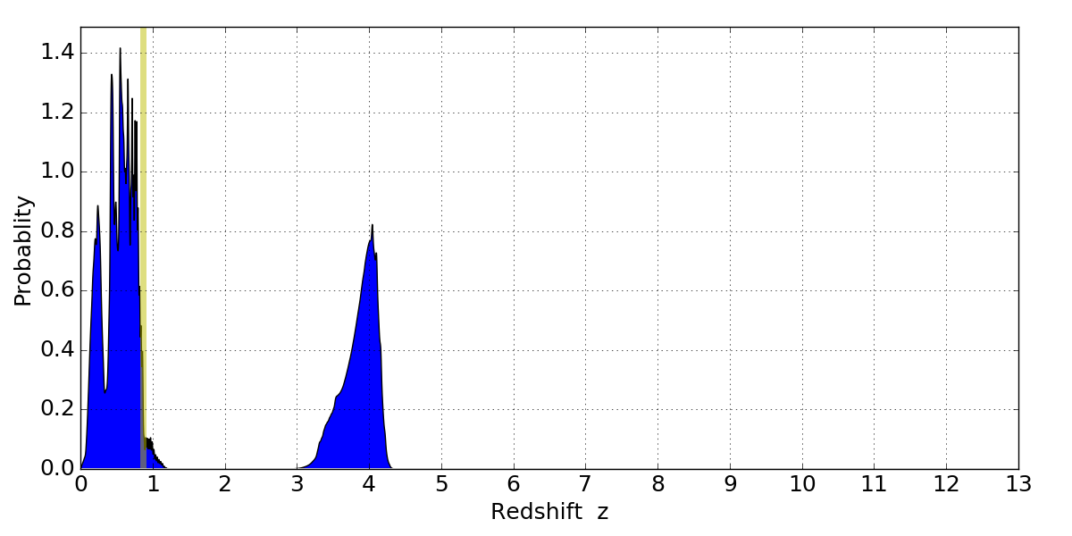 In P(z) plots: Yellow lines mark the cluster redshift z = 0.870,