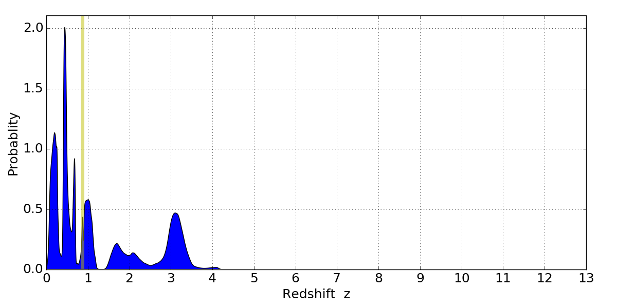In P(z) plots: Yellow lines mark the cluster redshift z = 0.870,