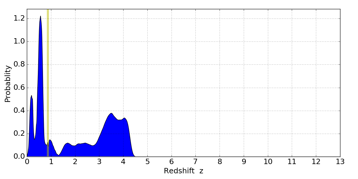 In P(z) plots: Yellow lines mark the cluster redshift z = 0.870,