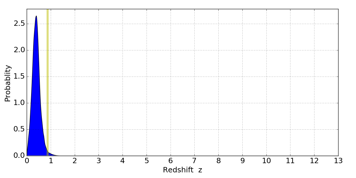In P(z) plots: Yellow lines mark the cluster redshift z = 0.870,
