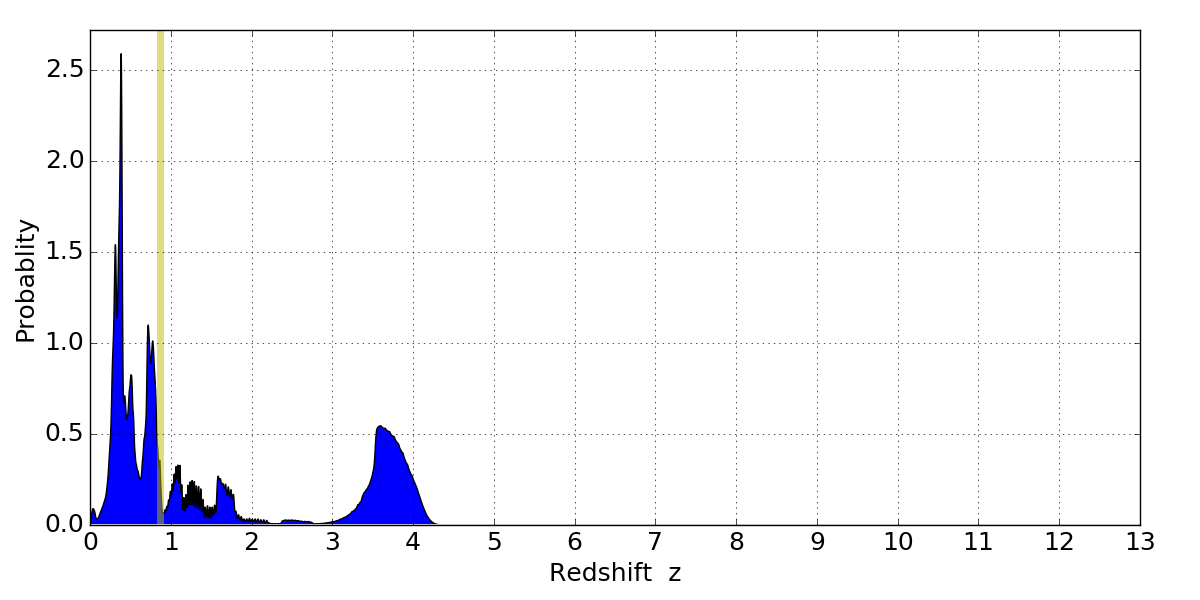 In P(z) plots: Yellow lines mark the cluster redshift z = 0.870,