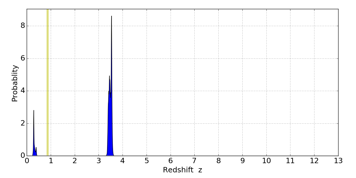 In P(z) plots: Yellow lines mark the cluster redshift z = 0.870,