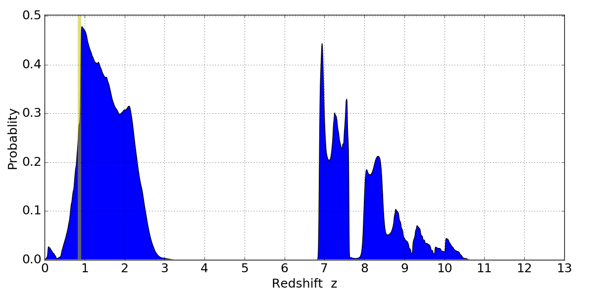 In P(z) plots: Yellow lines mark the cluster redshift z = 0.870,