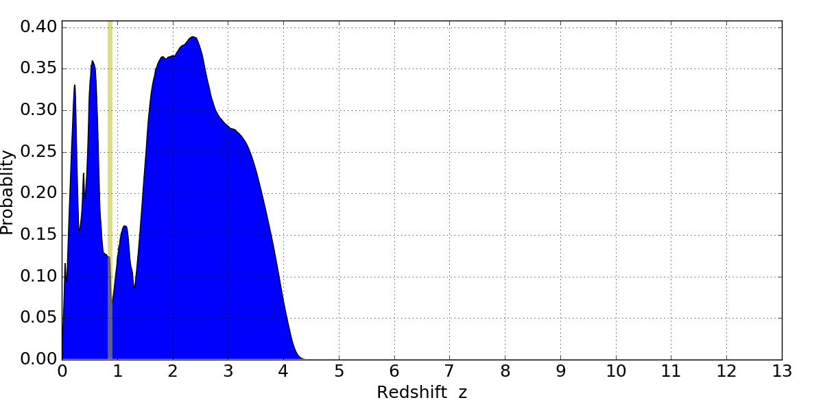 In P(z) plots: Yellow lines mark the cluster redshift z = 0.870,