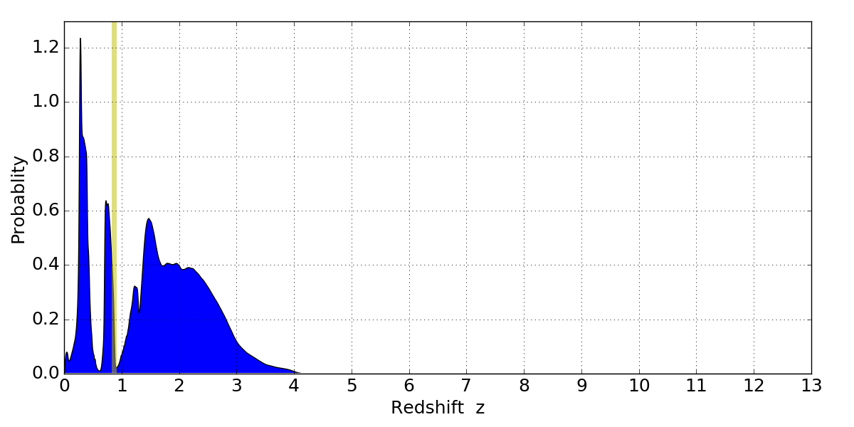 In P(z) plots: Yellow lines mark the cluster redshift z = 0.870,