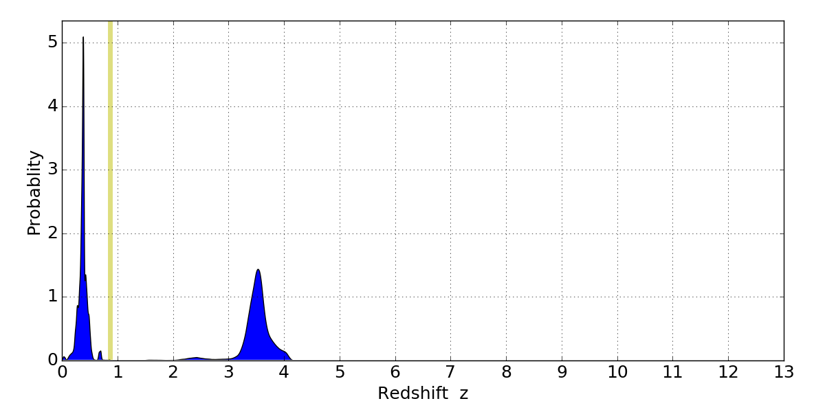In P(z) plots: Yellow lines mark the cluster redshift z = 0.870,