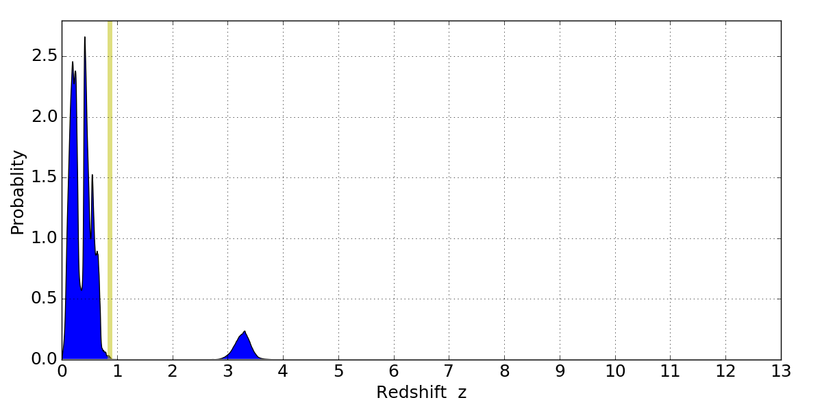 In P(z) plots: Yellow lines mark the cluster redshift z = 0.870,