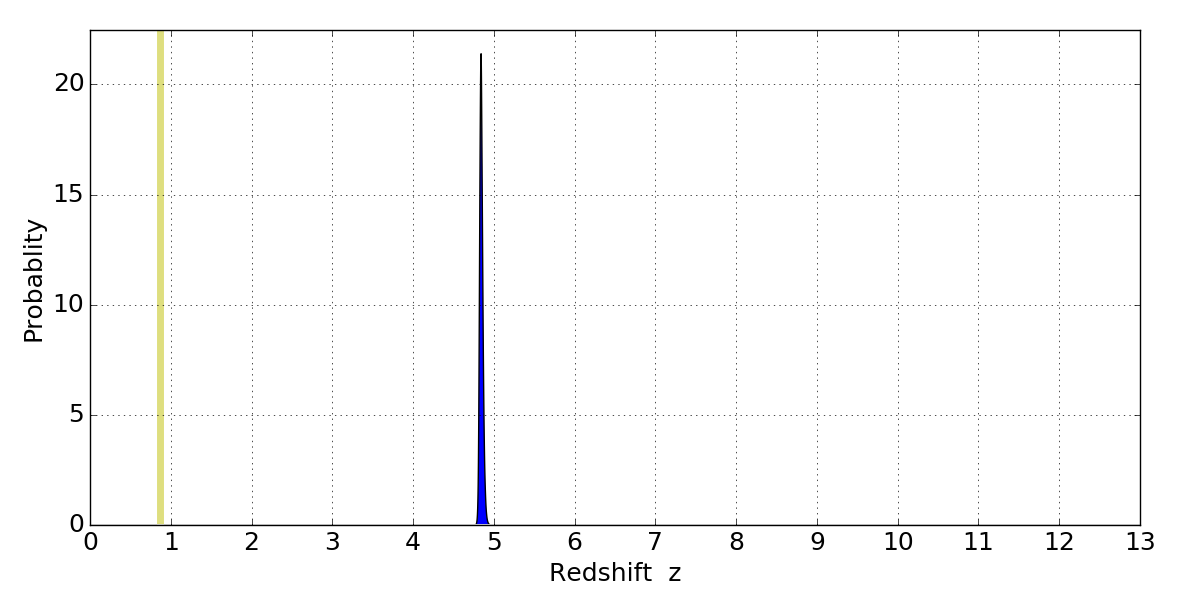 In P(z) plots: Yellow lines mark the cluster redshift z = 0.870,