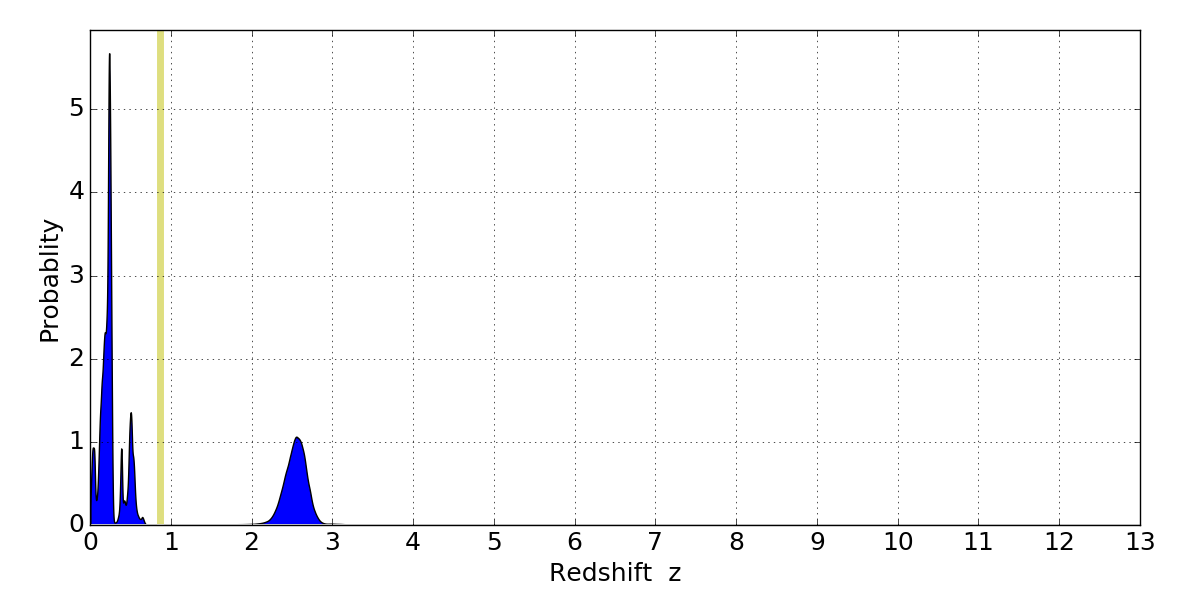 In P(z) plots: Yellow lines mark the cluster redshift z = 0.870,