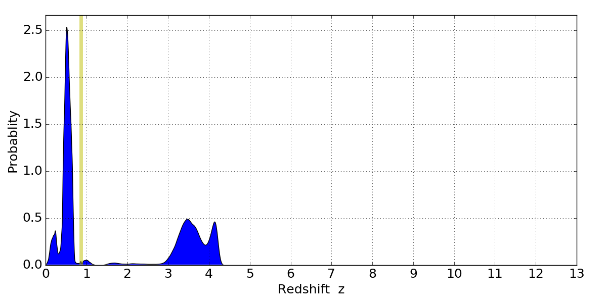 In P(z) plots: Yellow lines mark the cluster redshift z = 0.870,