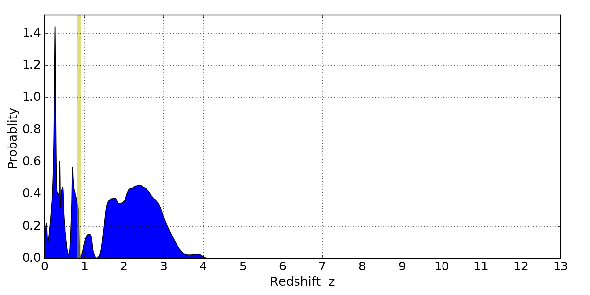 In P(z) plots: Yellow lines mark the cluster redshift z = 0.870,