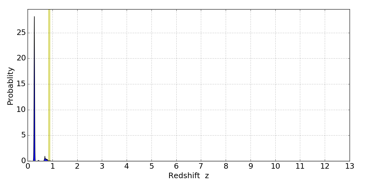 In P(z) plots: Yellow lines mark the cluster redshift z = 0.870,