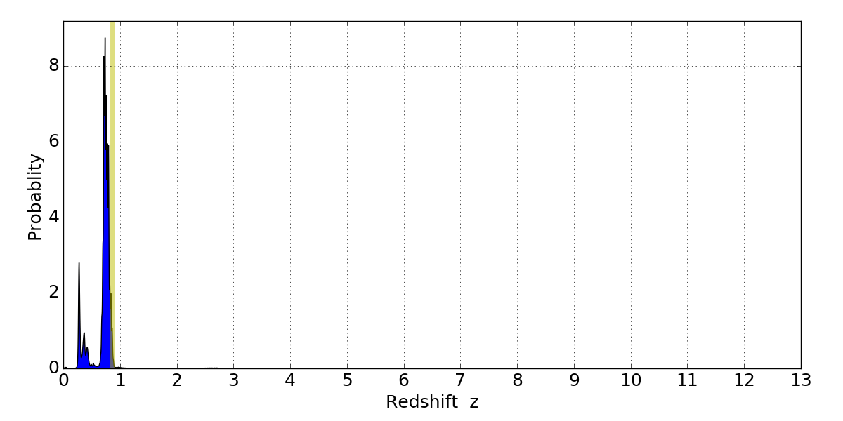 In P(z) plots: Yellow lines mark the cluster redshift z = 0.870,