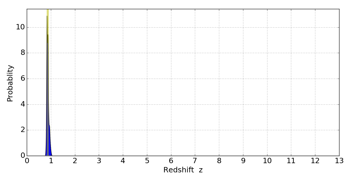 In P(z) plots: Yellow lines mark the cluster redshift z = 0.870,