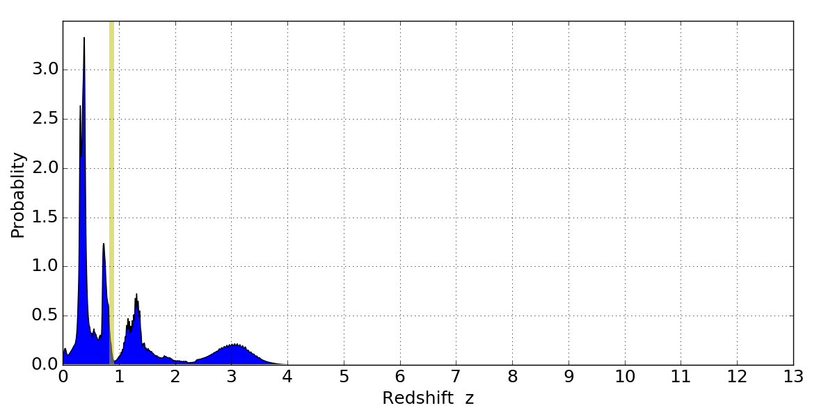 In P(z) plots: Yellow lines mark the cluster redshift z = 0.870,
