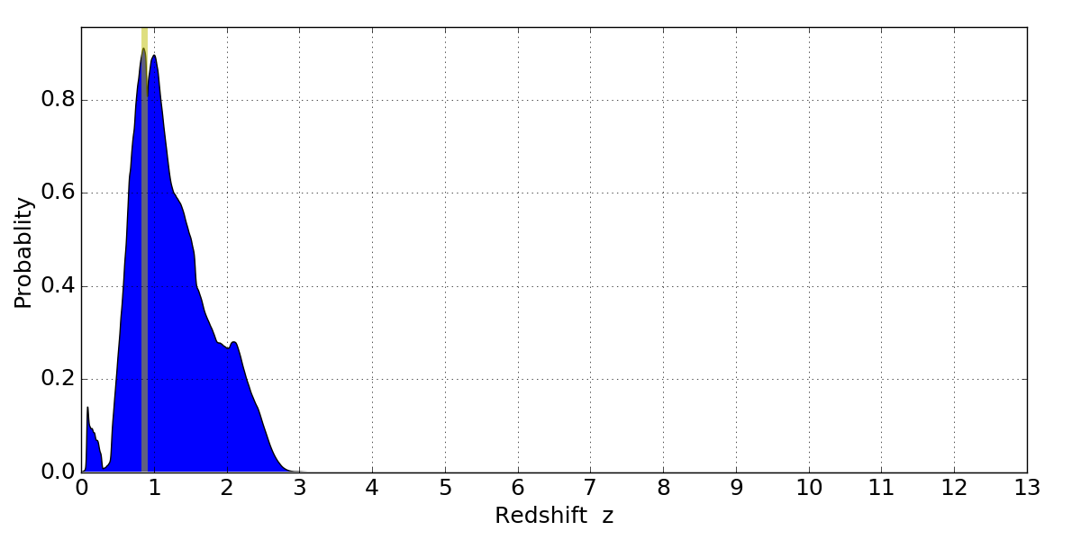 In P(z) plots: Yellow lines mark the cluster redshift z = 0.870,