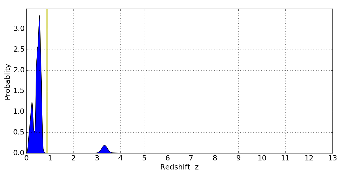 In P(z) plots: Yellow lines mark the cluster redshift z = 0.870,