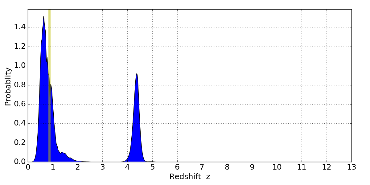 In P(z) plots: Yellow lines mark the cluster redshift z = 0.870,