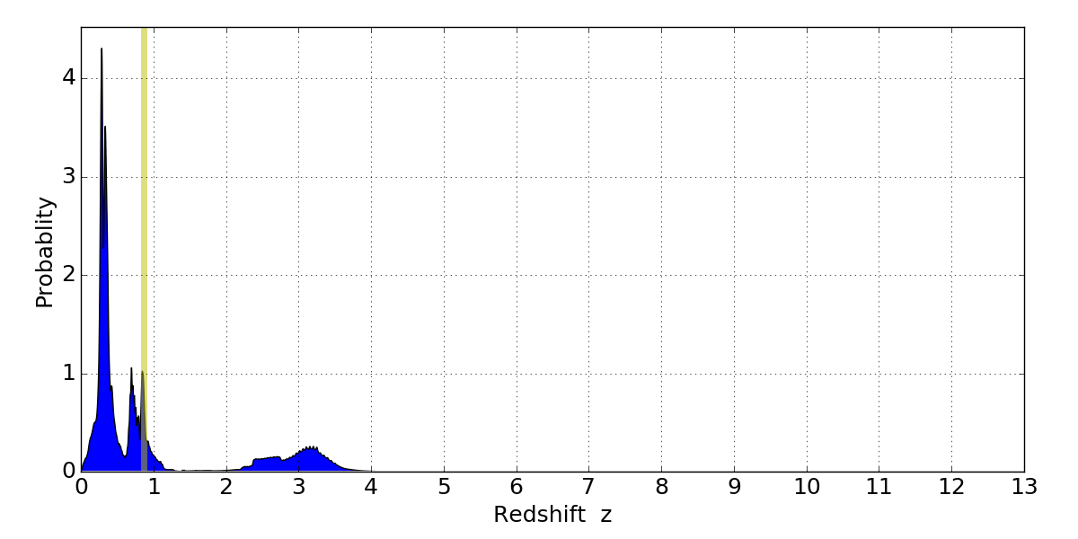 In P(z) plots: Yellow lines mark the cluster redshift z = 0.870,