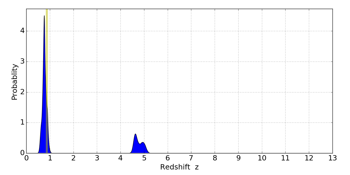 In P(z) plots: Yellow lines mark the cluster redshift z = 0.870,
