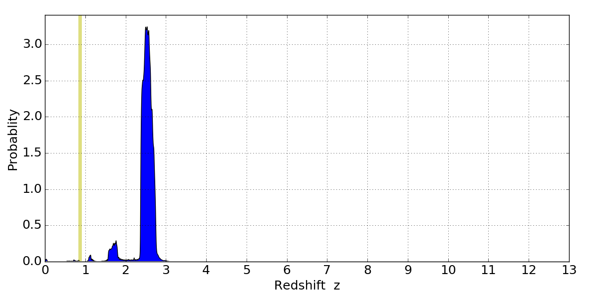 In P(z) plots: Yellow lines mark the cluster redshift z = 0.870,