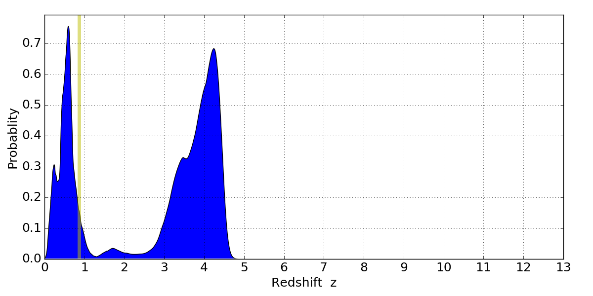 In P(z) plots: Yellow lines mark the cluster redshift z = 0.870,
