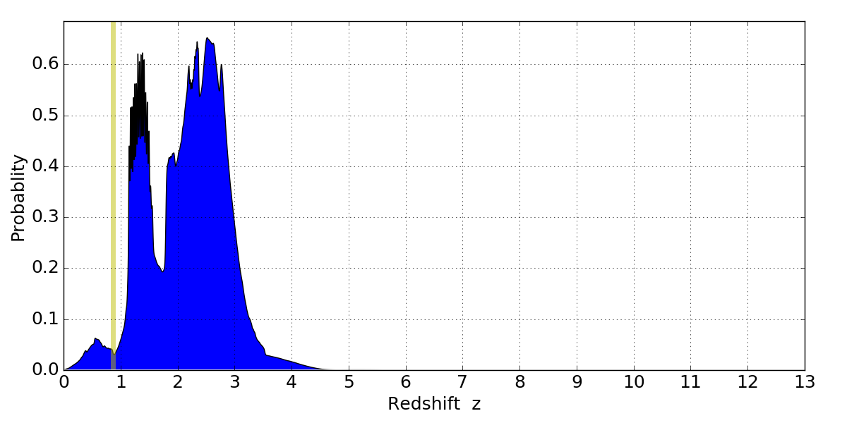 In P(z) plots: Yellow lines mark the cluster redshift z = 0.870,