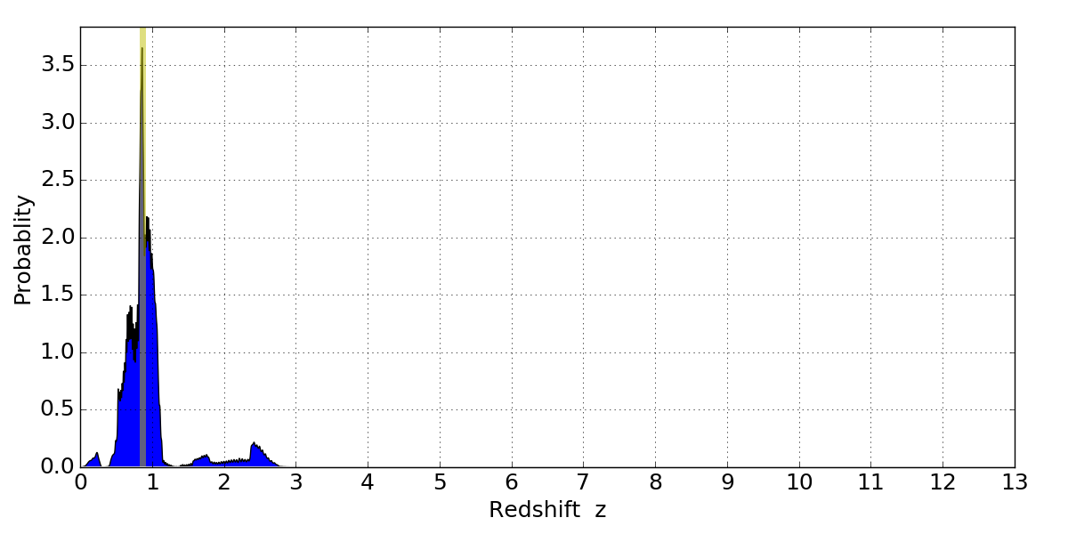 In P(z) plots: Yellow lines mark the cluster redshift z = 0.870,
