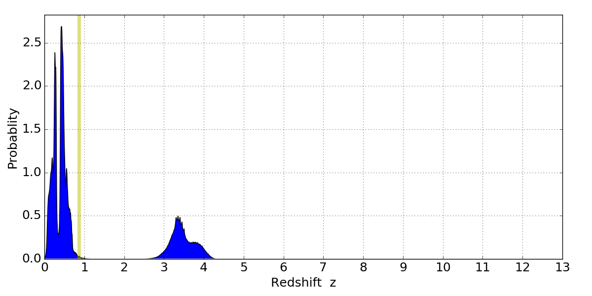 In P(z) plots: Yellow lines mark the cluster redshift z = 0.870,