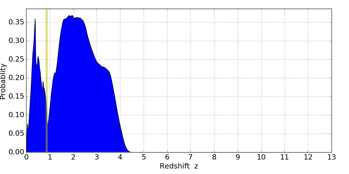 In P(z) plots: Yellow lines mark the cluster redshift z = 0.870,