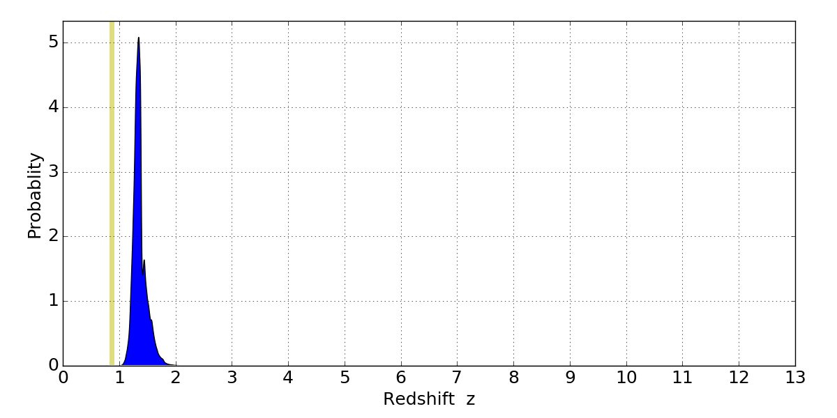 In P(z) plots: Yellow lines mark the cluster redshift z = 0.870,