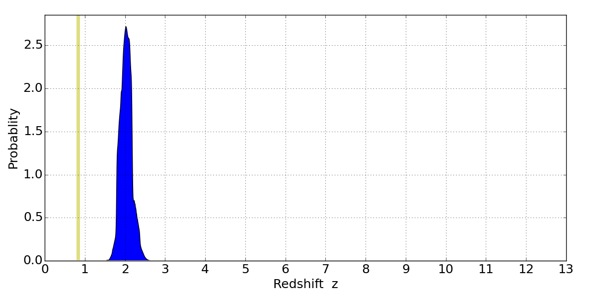 In P(z) plots: Yellow lines mark the cluster redshift z = 0.833,