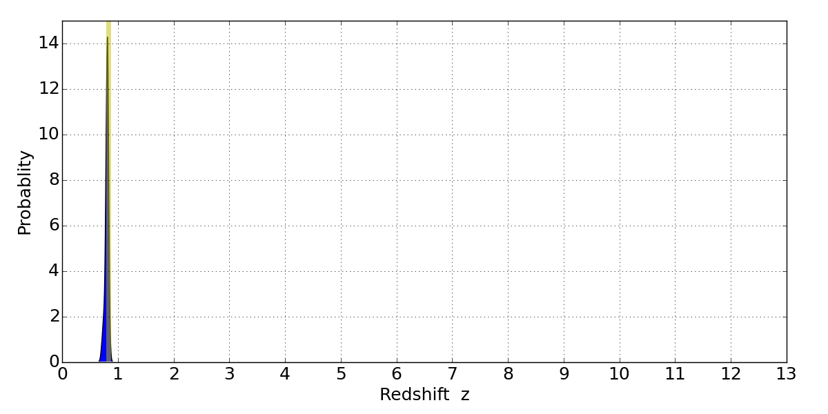 In P(z) plots: Yellow lines mark the cluster redshift z = 0.833,