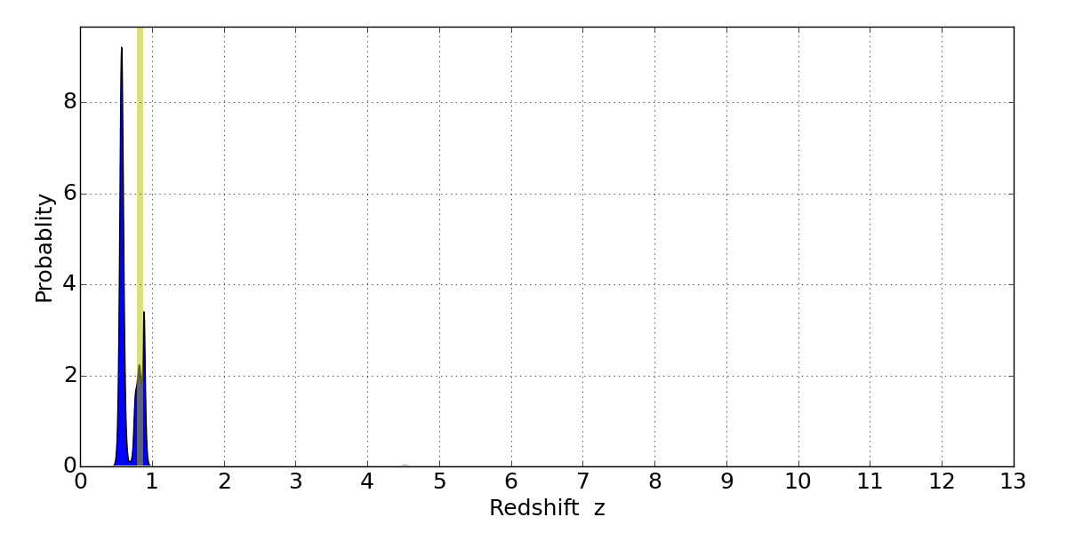 In P(z) plots: Yellow lines mark the cluster redshift z = 0.833,
