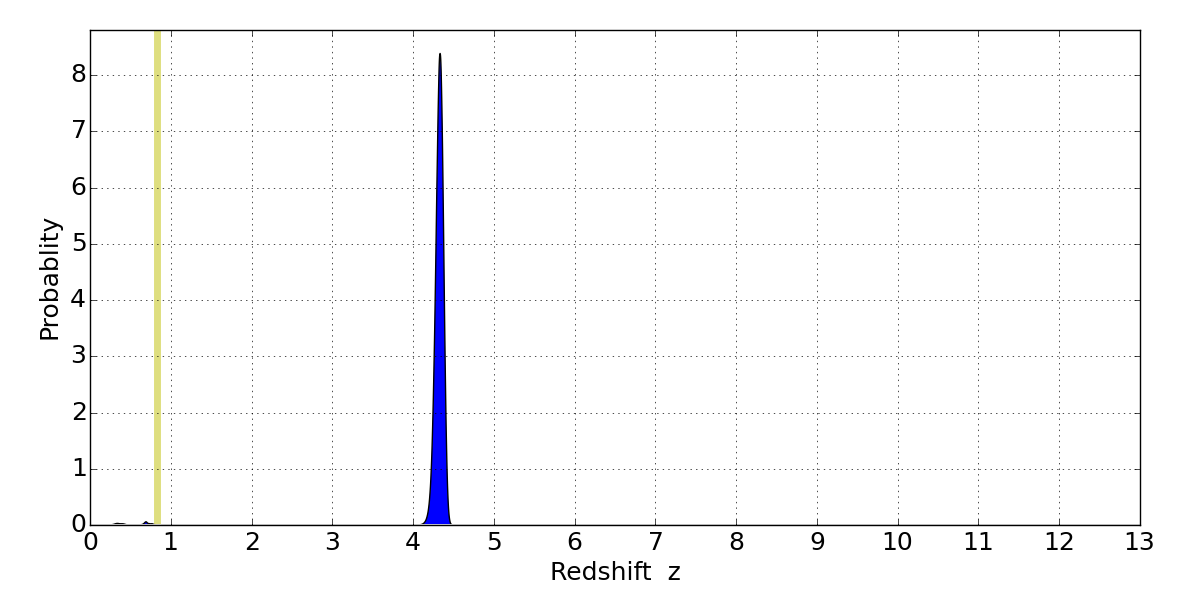 In P(z) plots: Yellow lines mark the cluster redshift z = 0.833,