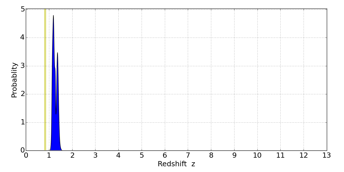 In P(z) plots: Yellow lines mark the cluster redshift z = 0.833,