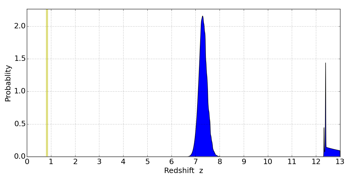 In P(z) plots: Yellow lines mark the cluster redshift z = 0.833,