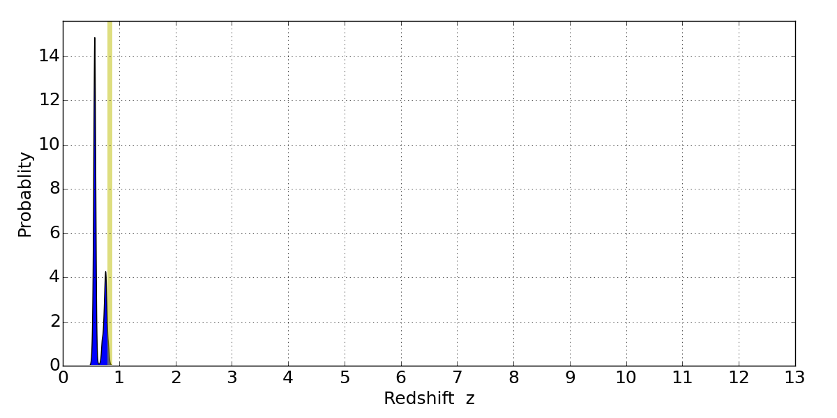 In P(z) plots: Yellow lines mark the cluster redshift z = 0.833,
