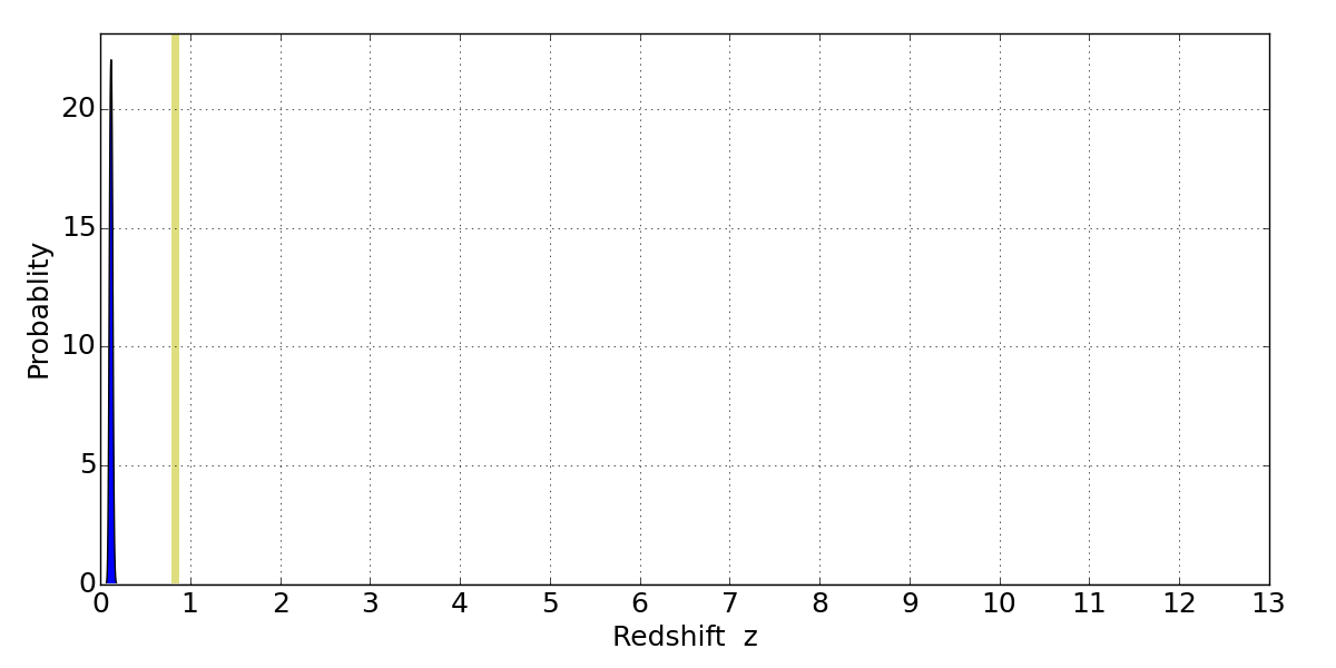 In P(z) plots: Yellow lines mark the cluster redshift z = 0.833,