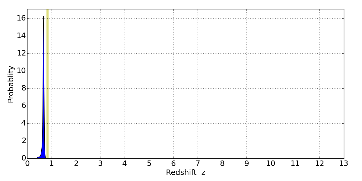 In P(z) plots: Yellow lines mark the cluster redshift z = 0.833,
