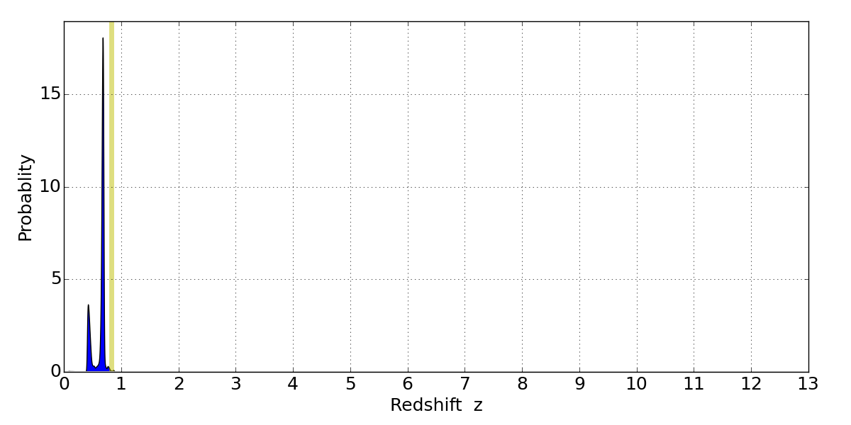 In P(z) plots: Yellow lines mark the cluster redshift z = 0.833,