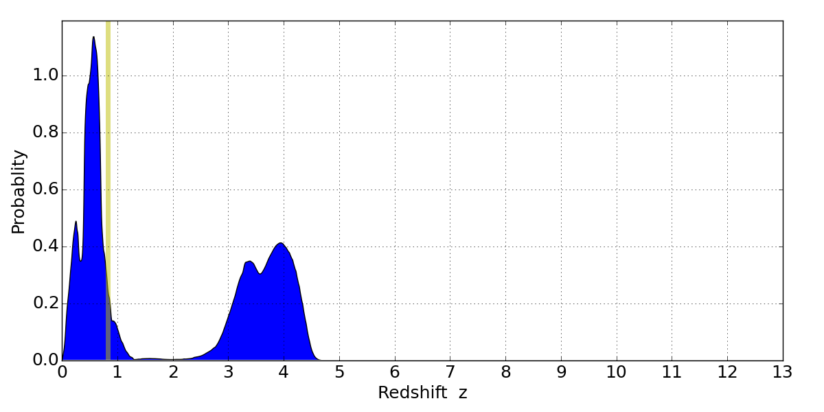In P(z) plots: Yellow lines mark the cluster redshift z = 0.833,