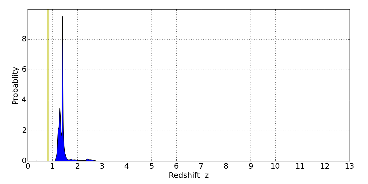 In P(z) plots: Yellow lines mark the cluster redshift z = 0.833,