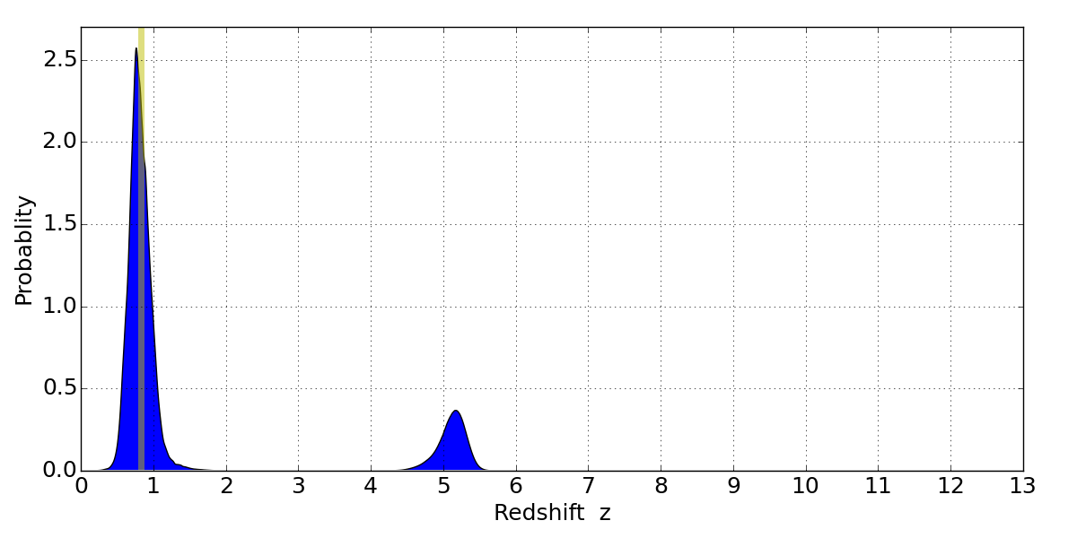 In P(z) plots: Yellow lines mark the cluster redshift z = 0.833,