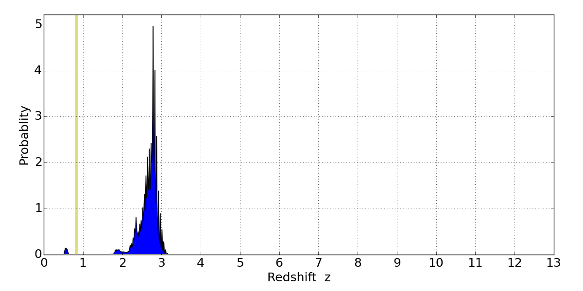 In P(z) plots: Yellow lines mark the cluster redshift z = 0.833,