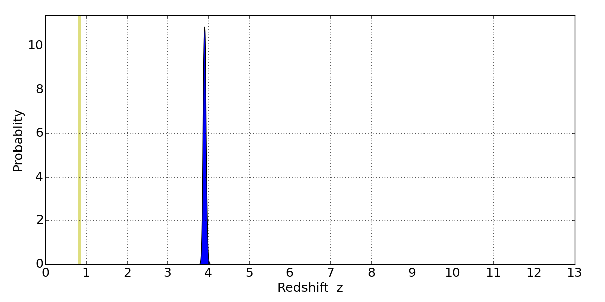 In P(z) plots: Yellow lines mark the cluster redshift z = 0.833,