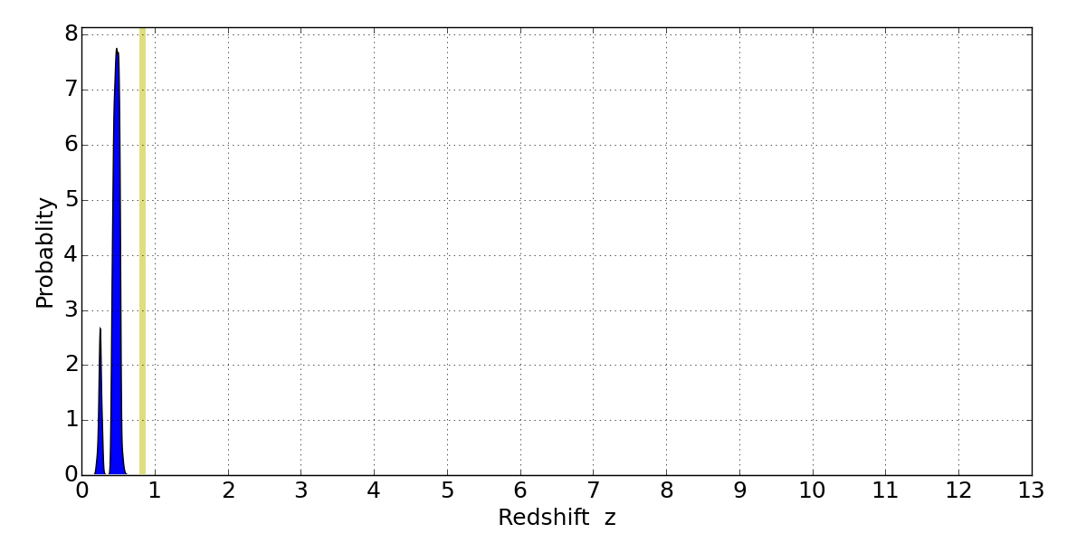 In P(z) plots: Yellow lines mark the cluster redshift z = 0.833,