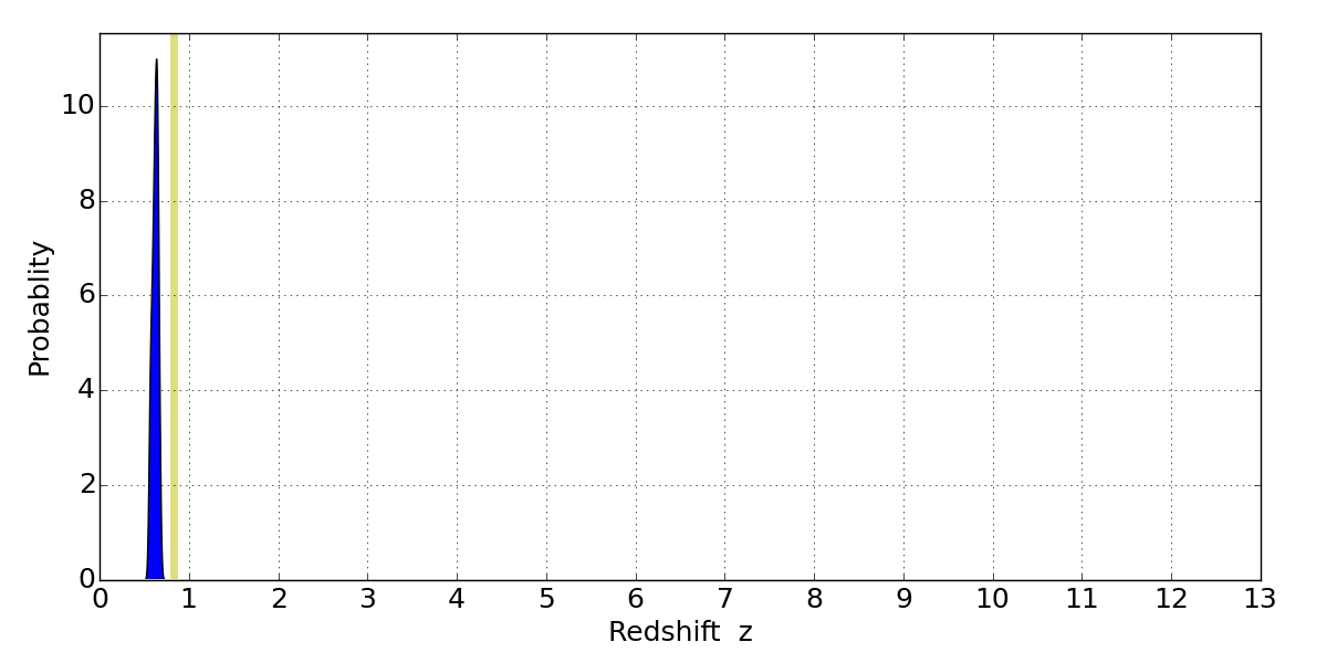 In P(z) plots: Yellow lines mark the cluster redshift z = 0.833,