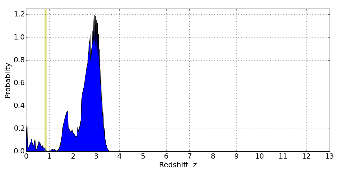 In P(z) plots: Yellow lines mark the cluster redshift z = 0.833,